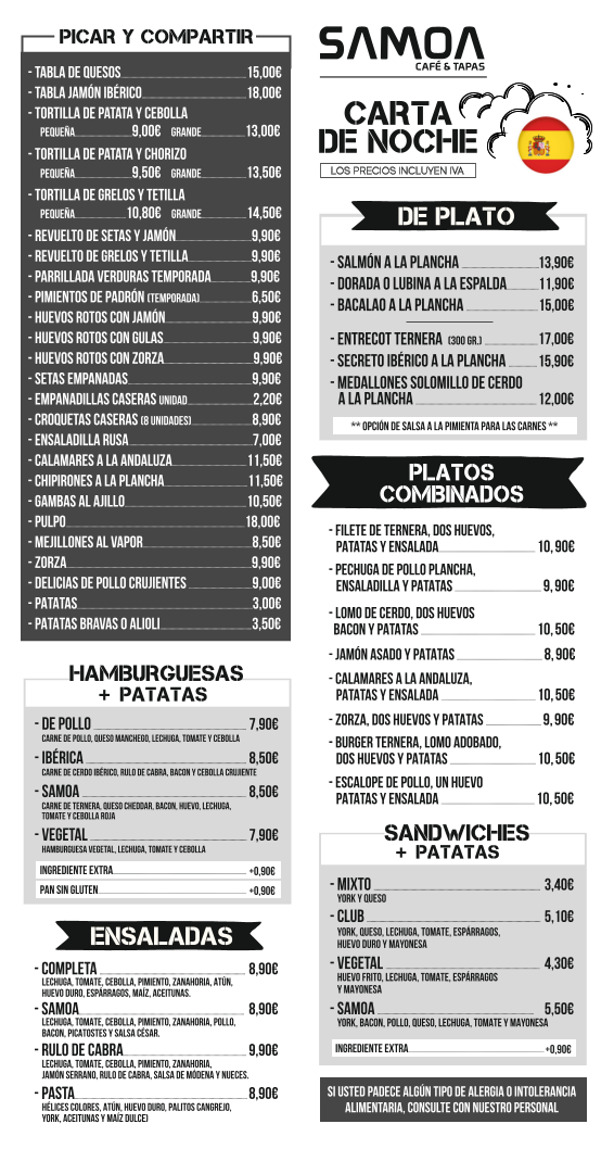 The menu at Cafés y tapas SAMOA features a variety of traditional Spanish and local dishes alongside a selection of beverages suitable for different times of the day. Visitors can find options for breakfast, snacks, and light meals that range from espresso-based coffee drinks to more substantial plates.