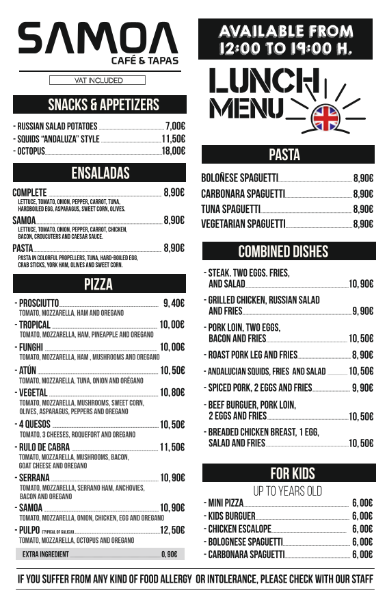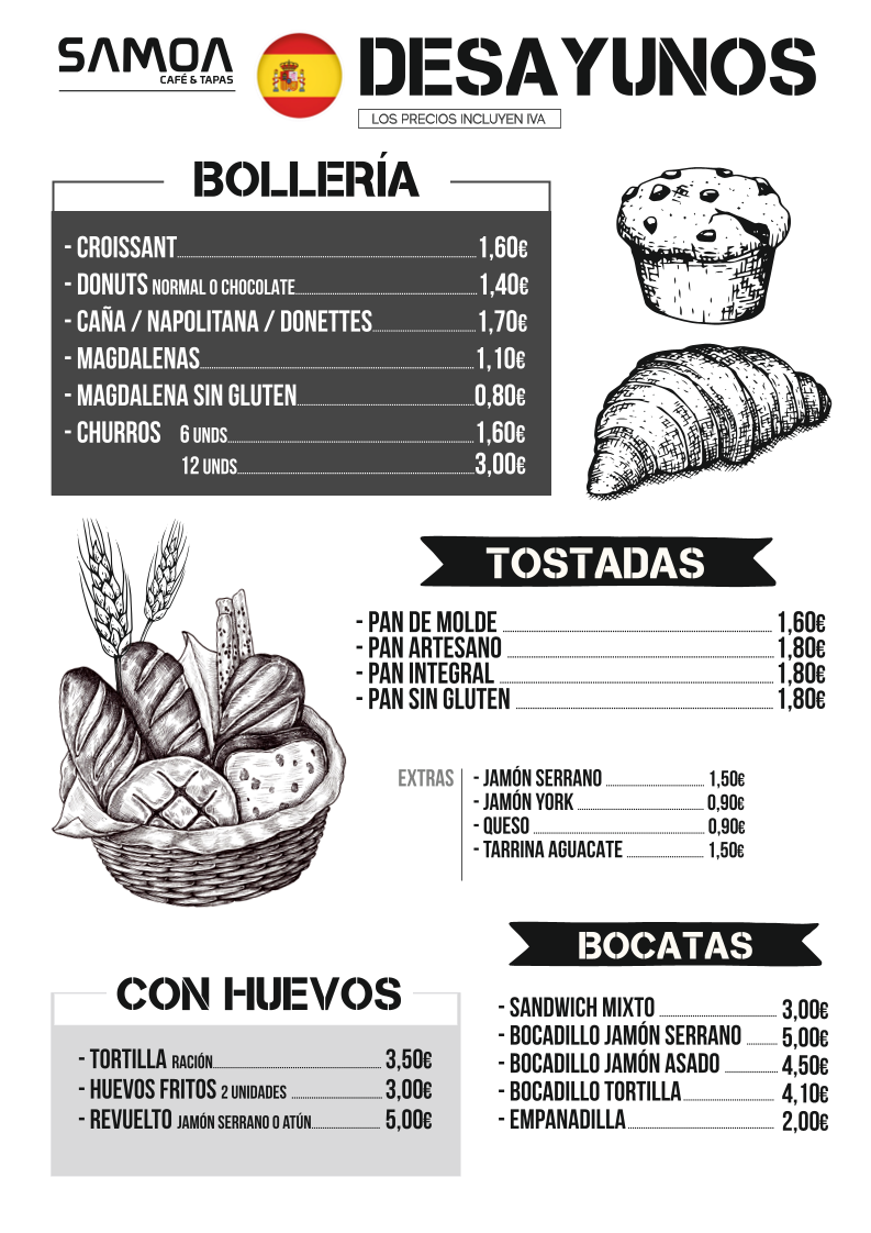 - Main Dishes: Light entrees including scrambled eggs with mushrooms and ham, pechuga de pollo a la plancha, hamburguesa Samoa, chipirones a la plancha, dorada a la plancha, and manasado y patatas.